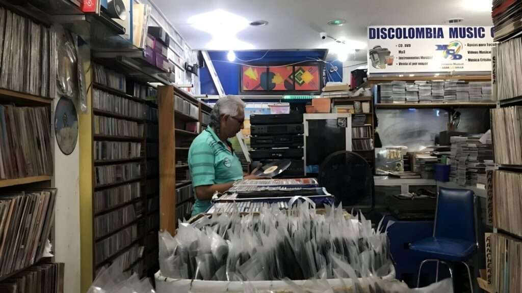 En ese instante subimos por esta lámina de pavimento deforme y cubierta por baldosas en algunas partes, y damos unos cinco pasos en dirección a la sucursal hermana del reconocido almacén de venta de vinilos Discolombia-que está emplazado al lado de un local de gafas a la vuelta de esta calle- perteneciente a los mismos dueños de esta: El infinitamente menos conocido Music Center Discolombia.