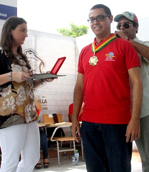 El educador Fabián Padilla recibe del alcalde Alex Char y de la secretaria de Educación Karen Abudiden la medalla que lo distingue como el mejor docente.