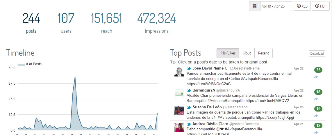 En solo una semana, con corte al martes 26 de abril, ya hay 107 usuarios que trinaron con el hashtag. Son personas de todas las edades, perfiles y ocupaciones que convirtieron en un fuerte eco en Twitter lo que comenzó como una idea de preocupación de la joven periodista. Y la cosa va creciendo tanto que concejales y senadores decidieron hacer sus propios trinos con el #AvíspateBarranquilla. Esta semana apareció ya la cuenta @AvispateBaq que es el segundo paso con el cual esta iniciativa busca consolidarse en nuestra sociedad.