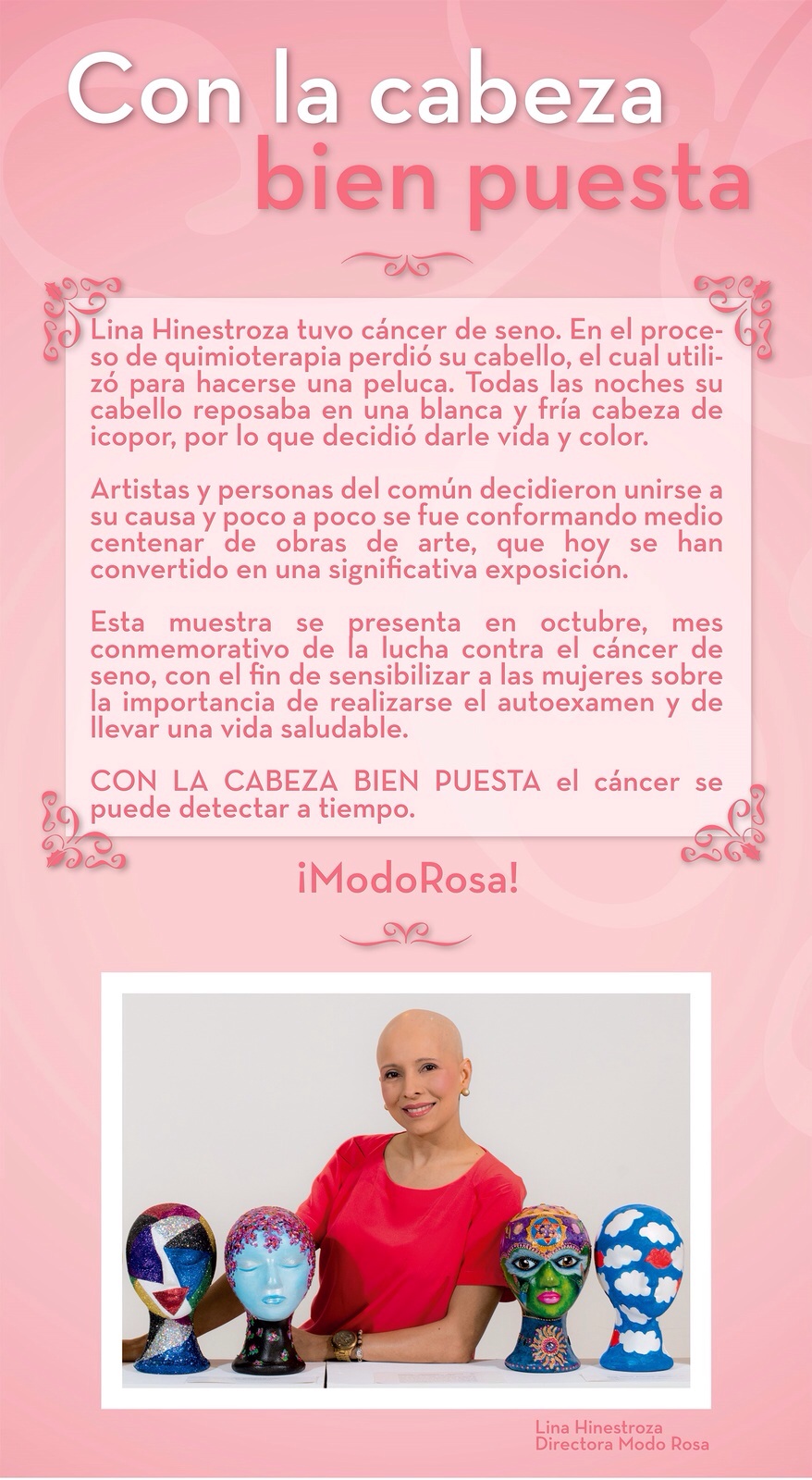 Es así como desde hoy lunes y hasta el viernes 8 de octubre el aeropuerto Ernesto Cortissoz  tiene abierta la exposición itinerante “Con la cabeza bien puesta”; un homenaje para las mujeres que pierden su cabello con los tratamientos de quimioterapia. Las mismas figuras (22 cabezas adornadas con distintos motivos) también estarán en el Centro Comercial Buenavista del 9 al 12 de octubre, aunque desde el pasado fin de semana su fachada y pasillos internos también promocionan la lucha contra el cáncer de seno.
