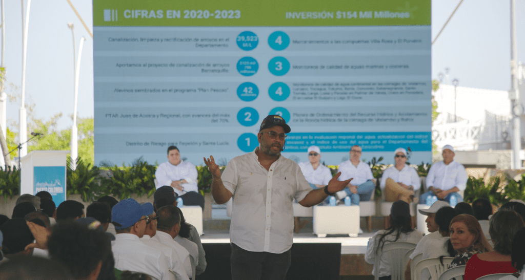 El acto realizado en la plaza del municipio de Puerto Colombia, el Director de la Corporación Autónoma Regional del Atlántico C.R.A., Jesús León Insignares, presentó resultados de su gestión en la ejecución del Plan de Acción Cuatrienal, vigencia 2023 y avances del 2020-2023, reportando inversiones por $154 mil millones y un cumplimiento físico del 93,40%, cuya estructura incluye 27 programas, 60 proyectos y 186 acciones estratégicas, con un alto impacto ambiental en los municipios de su jurisdicción.