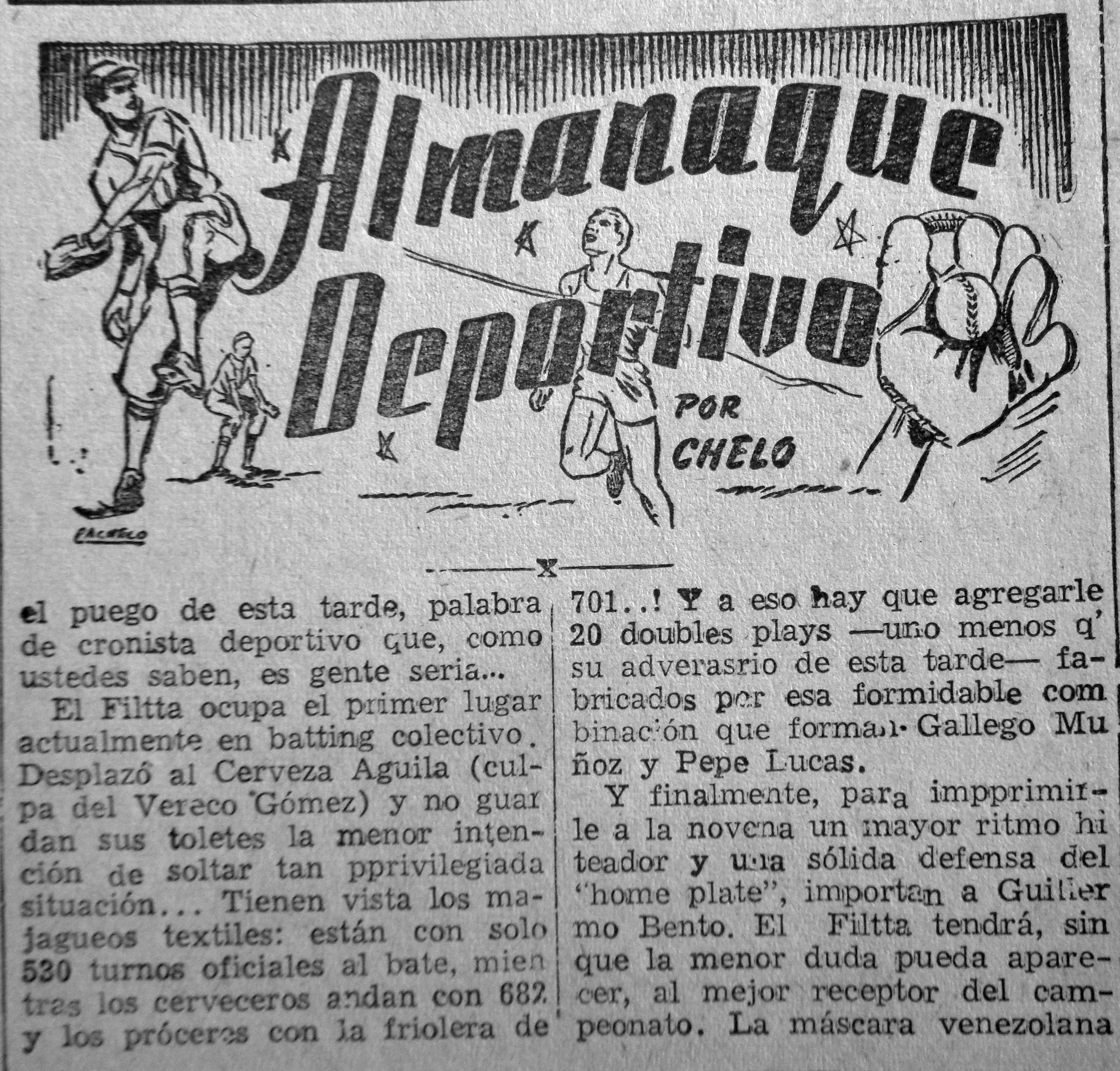 «El juego de esta tarde, palabra de cronista deportivo que, como ustedes saben, es gente sería…El Filtta ocupa el primer lugar actualmente en batting colectivo. Desplazó a Cerveza Águila (culpa del Veneco Gómez) y aguantan los toletes la menor intención de soltar tan privilegiada situación…tienen vista los majagueos textiles están con solo 530 turnos oficiales al bate, mientras los cerveceros andan con 682 y los próceres con la friolera de 701. Y eso hay que agregarle 20 doubles plays -uno menos que su adversario de esta tarde- fabricados por esa formidable combinación que forman: Gallego Muñoz y Pepe Lucas. Y finalmente para imprimirle a la novena un mejor ritmo hiteador y una sólida defensa del ‘home plate’ importan a Guillermo Bento. El Filtta tendrá sin que la menor duda pueda aparecer al mejor receptor del campeonato. La máscara venezolana», dice ese primer texto, de gran valor histórico.