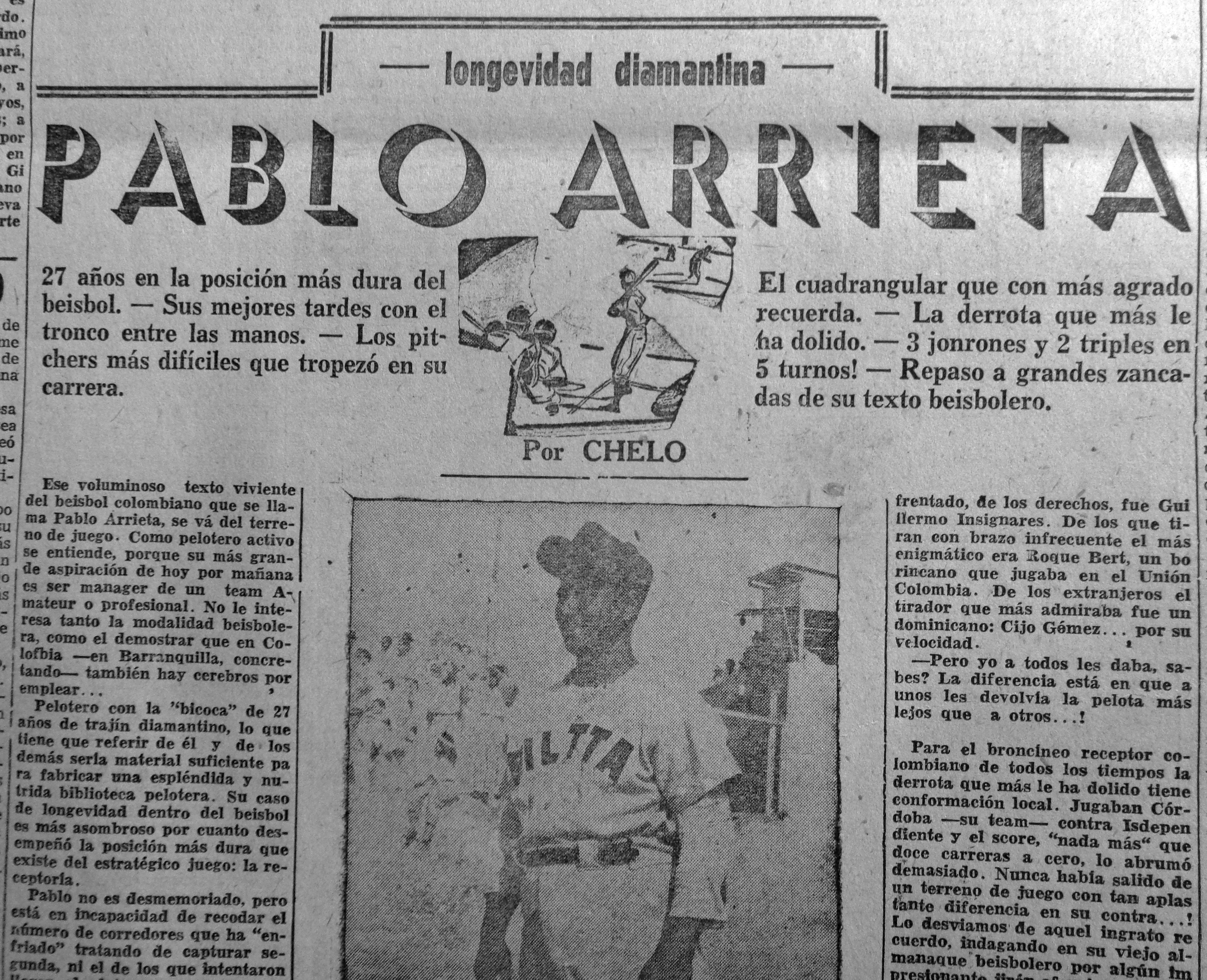 «Ese voluminoso texto viviente del béisbol colombiano que se llama Pablo Arrieta, se va del terreno de juego. Como pelotero activo se entiende porque su más grande aspiración de hoy por mañana es ser manager de un team amateur o profesional. No le interesa tanto la modalidad beisbolera como demostrar que en Colombia -en Barranquilla, concretamente- también hay cerebros por emplearlo.