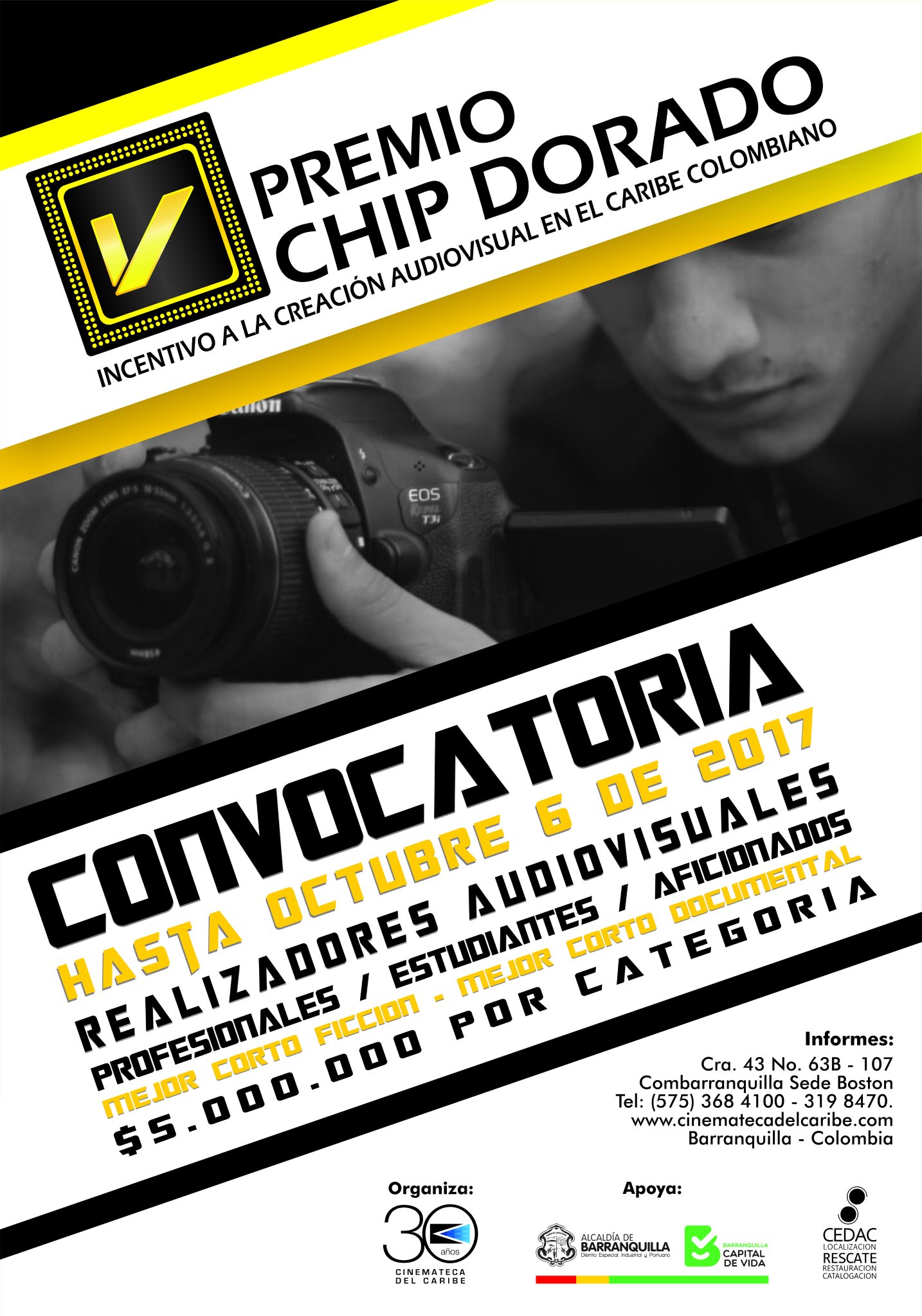 Cada aspirante podrá presentar máximo una (1) obra participante por cada categoría disponible. Se recibirán cortometrajes documentales con una duración máxima de cuarenta (40) minutos y de ficción con una máxima de treinta (30). Subgéneros, estéticas y temas son de libre escogencia del realizador, tanto en ficción como en documental. La temática será libre, autónoma e independiente del eje académico del Salón Internacional del Autor Audiovisual, en cuyo marco tiene ocurrencia el presente premio. Las inscripciones deberán realizarse hasta el viernes 6 de octubre de 2017 a las 11:59 pm (hora Colombia) a través del correo electrónico: premiochipdorado@cinematecadelcaribe.com. Los detalles de inscripción, como las demás bases del concurso, se publicarán en la página web de la Cinemateca del Caribe: www.cinematecadelcaribe.com. Para mayor información están disponibles las líneas telefónicas: (5) 3684100 – 3198470 y el correo: info@cinematecadelcaribe.com.