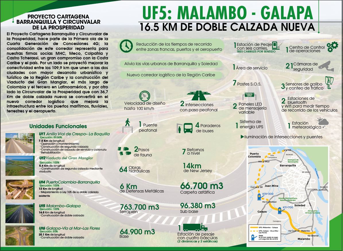 La vía está compuesta por dos calzadas vehiculares de 7,30 metros, berma interna de 1 metro y berma externa de 2,50 metros, con velocidades de diseño hasta de 100 km/h. La doble calzada tendrá 2 peajes, uno pago y otro de control. Los otros 20,6 km que van desde la Cordialidad, cruzando la carrera 38, a la altura de Juan Mina, atravesando la Vía al Mar en Puerto Colombia, para terminar en la prolongación de la Vía 40, sector de Las Flores, en Barranquilla serían entregado en los próximos meses. Esta nueva Circunvalar, que integra a Malambo, Galapa y Puerto Colombia, municipios del área metropolitana de Barranquilla, hace parte de la primera ola de la Cuarta Generación de Concesiones (4G) de la ANI. El proyecto es ejecutado por la Concesión Costera Cartagena Barranquilla S.A.S., integrada por las firmas MHC, Meco, Colpatria y Castro Tcherassi. La interventoría es de MAB ingeniería de Valor.