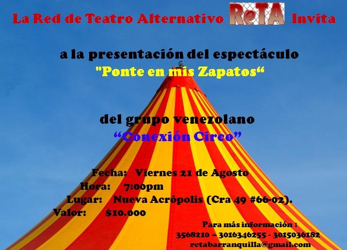 La Red de Teatro Alternativo de Barranquilla (RETA) le extiende a todos los chachareros la invitación a la función “Ponte en mis Zapatos” de la compañía venezolana “Conexión Circo”. La función será hoy, viernes 21 de agosto a las 7:00 pm en la Fundación Nueva Acrópolis en la Carrera 49 # 66-02. La entrada tiene un valor de $10.000.