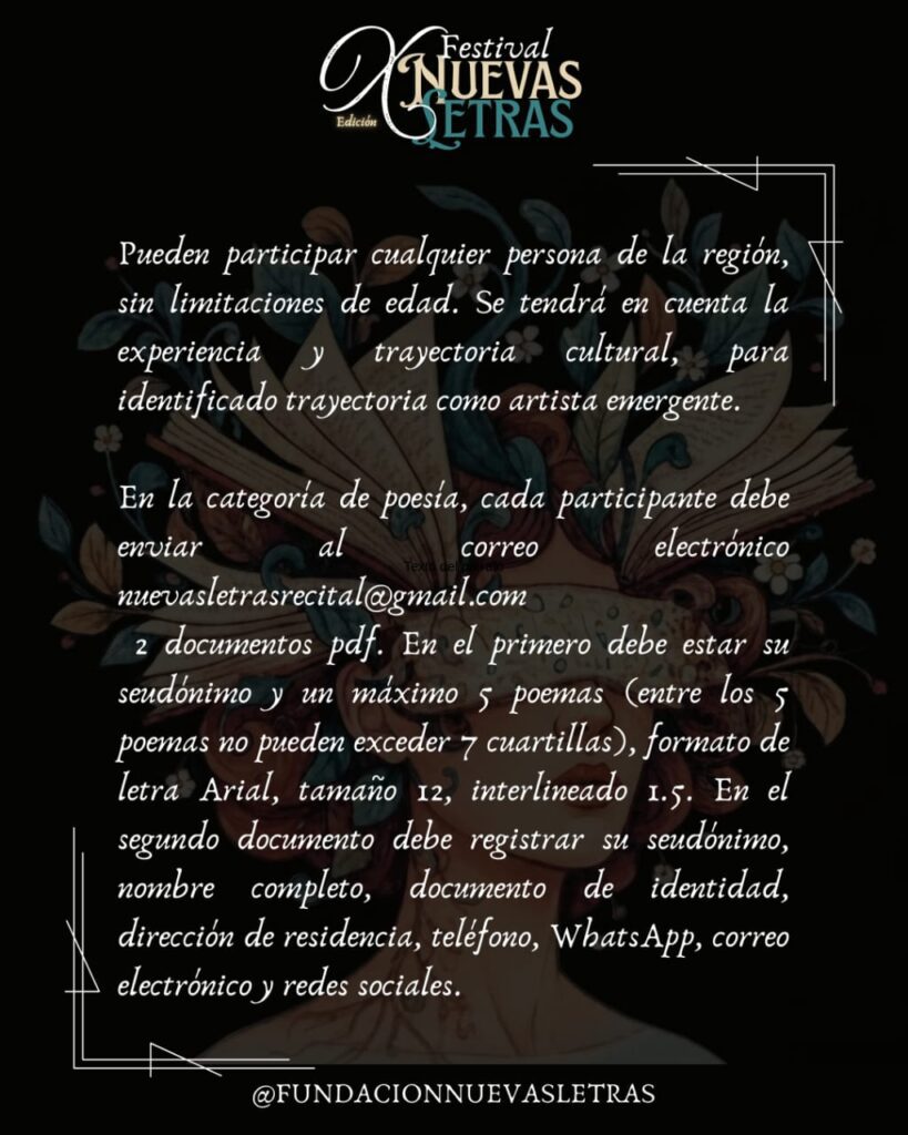 En la categoría de poesía, cada participante debe enviar correo electrónico nuevasletrasrecital@gmail.com 2 documentos pdf. En el primero debe estar su seudónimo y un máximo 5 poemas (entre los 5 poemas no pueden exceder y cuartillas), formato de letra Arial, tamaño 12, interlineado I.5. En el segundo documento debe registrar su seudónimo, nombre completo, documento de identidad, dirección de residencia, teléfono, WhatsApp, correo electrónico y redes sociales.