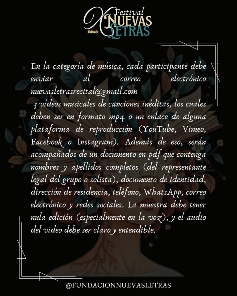 En la categoría de música, cada participante debe enviar correo electrónico nuevasletrasrecital@gmail.com 3 vídeos musicales de canciones inéditas, los cuales deben ser en formato mp4 o un enlace de alguna plataforma de reproducción (YouTube, Vimeo, Facebook o Instagram). Además de eso, serán acompañados de un documento en pdf que contenga nombres y apellidos completos (del representante legal del grupo o solista), documento de identidad, dirección de residencia, teléfono, WhatsApp, correo electrónico y redes sociales. La muestra debe tener nula edición (especialmente en la voz), y el audio del video debe ser claro y entendible.