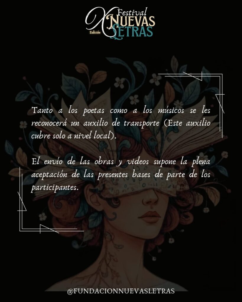 Desde el 25 de septiembre al 15 de octubre. Tanto a los poetas como a los músicos se les reconocerá un auxilio de transporte (Este auxilio cubre solo a nivel local). El envío de las obras y videos supone la plena aceptación de las presentes bases de parte de los participantes.
