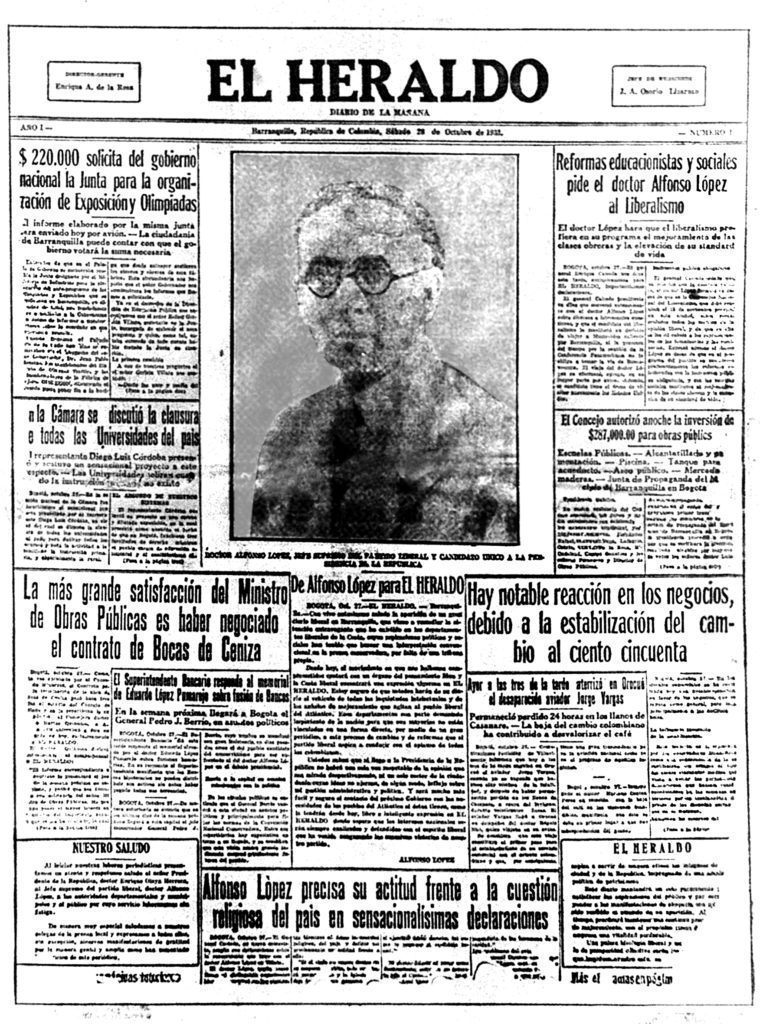 Primera página del primer ejemplar de El Heraldo del 28 de octubre de 1933, con la fotografía y un mensaje de Alfonso López Pumarejo, dándole la bienvenida al primer diario Liberal de Barranquilla, el Atlántico y la Costa Caribe colombiana.