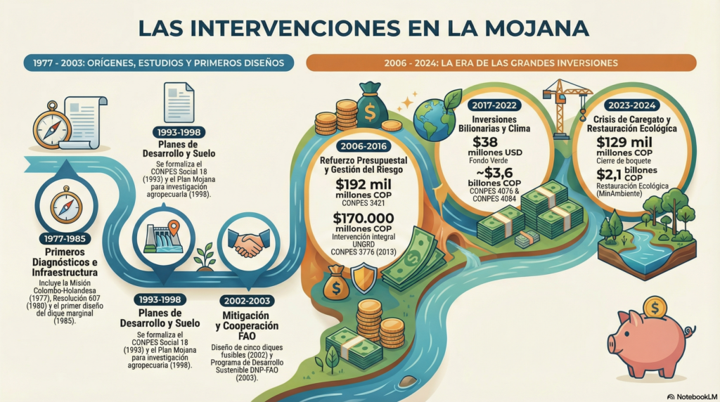 «A diferencia del interior, en la Mojana la dinámica humana se rige por la del agua. No es una marea, sino un pulso vinculado a las montañas que moviliza magnitudes colosales: el río San Jorge fluye con hasta 600 metros cúbicos por segundo, el Cauca alcanza los 6.000 metros cúbicos por segundo y el Magdalena llega a los 8.000 metros cúbicos por segundo. Esta fuerza pulsante, cargada de sedimentos, rige la subsistencia de pueblos que, desde la cultura Zenú, aprendieron a convivir con el fango. El río no es solo líquido; es una mezcla hidrosedimentológica que deposita vida o destrucción. Por ello, las decisiones descontextualizadas tomadas desde el centro del país suelen fracasar: no se puede gestionar un territorio sin entender que el mojanero lleva el ritmo fluvial en las venas».