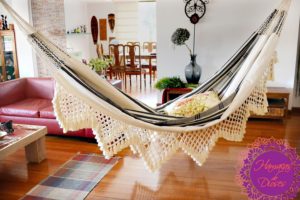 Estas hamacas tienen un buen estado de cumplido o de largo, y a los cabos deste largo dejan, de los mismos hilos della, muchas asas, y en cada asa ponen unos hilos delgados de cierta otra cosa, más recia que algodón, como cáñamo, y éstos son tan luengos como una braza de cada parte, y al cabo de todos ellos júntanse como en un puño, y deste puño, de los postes de las casas los atan de ambas partes, y así quedan las hamacas en el aire y allí se echan; y como ellas sean las buenas de 3 o 4 varas y más en ancho, ábrenlas cuando se echan como abriríamos una honda que fuese muy grande, pónense atravesados como en sosquín, y así sobra de la hamaca con qué cobijarse, y, porque no hace frío alguno, bástales. Para quien usa dormir en una de ellas cosa es descansada, puesto que no debe ser sana por la humedad del suelo, que aunque esté alta, del que no puede estar más de medio estado porque se puede subir en ella, penetra el cuerpo humano, y aunque se pusiese alto en un sobrado, todavía por la humedad de la noche haría daño. Al menos son muy limpias, y, para por los caminos, aun en Castilla, los veranos, serían harto estimadas”.