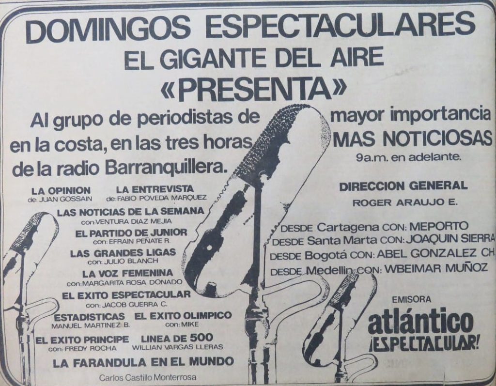 «Emisora Atlántico era una emisora de programación, es decir que estaba dividida por segmentos. La programación radial comenzaba a las cinco de la mañana con el Noticiero Atlántico en Noticias que presentaba y dirigía Ventura Díaz Mejía; a las siete arrancaba la franja de Deporte Espectacular con Fabio Poveda Márquez. Luego de las noticias y el deportes, a las nueve Jacob Guerra con un magazín musical. En las tardes Gilberto Estor Lara, con la música vallenata.