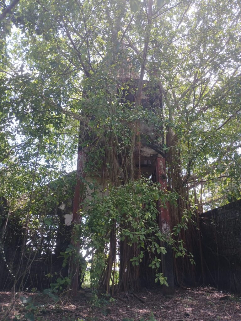Las columnas de la iglesia se las está comiendo un árbol de Suan, que le gana altura a la torre; las raíces del dueño primitivo abrazan la construcción formando una trampa de monte que devora los escombros de la fe. La fe de unos pobladores que un día soñaron una vida nueva y que hoy, en su nuevo asentamiento, ni siquiera tienen un templo para elevar sus oraciones.