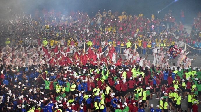 El evento empieza a coger calor humano a medida que se llena, el mantel blanco nos dice que la mesa pronto estará servida. En el arriar de las banderas, las delegaciones entran y el público se estremece, se forman y las palabras iniciales son sobre lo formidable que fueron los Juegos, agradeciendo en particular a los voluntarios que día tras día hicieron que esto fuese una realidad. A su vez se habló de la importancia del cuidado al medio ambiente en el que se trabajó para reciclar y concientizar a las personas de la importancia del mismo.
