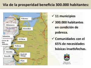 En total son 11 municipios y más de 300 mil habitantes en condición de pobreza que iban a ser beneficiados con la obra llamada a “cambiar la historia del Magdalena”, según decía la gobernación del departamento en el año 2013. La primera fase va desde Palermo a Sitio Nuevo con una longitud de algo más de 18 kilómetros.