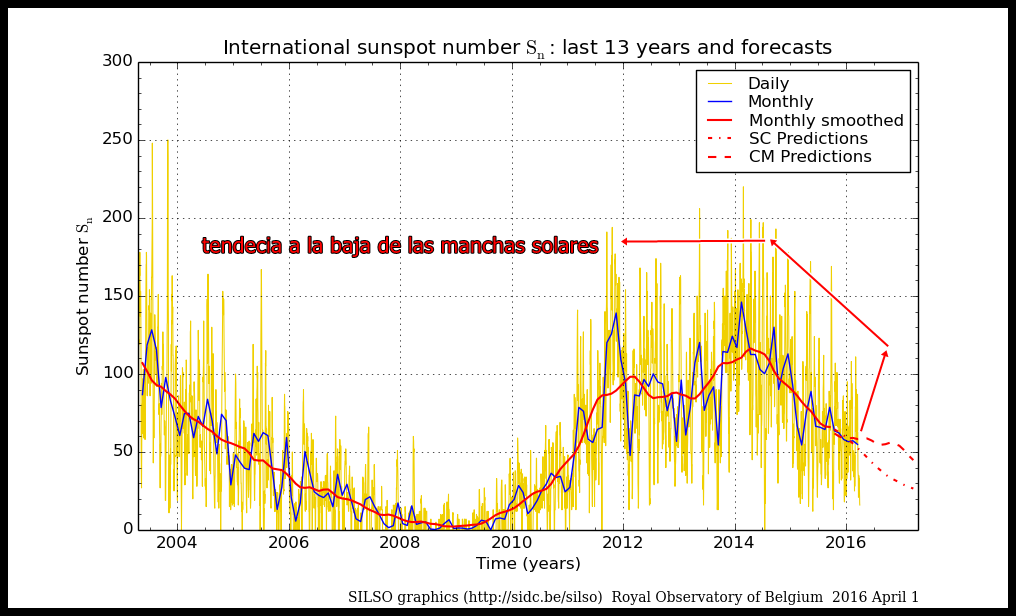 En el mínimo solar se reducen las manchas solares como está ocurriendo en la actualidad (observar gráfico tendencia a la baja de las manchas solares), esto trae como consecuencia que el clima de la Tierra se hace más frío. Es decir, desciende la temperatura, como ocurrió hace más de tres siglos, entre 1650 -1700, conocido como Mínimo Maunder, bajando las temperaturas en Europa, produciendo una mini edad de hielo durante el tiempo que duró la baja de las manchas solares.