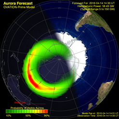 Imagen de aurora sobre el Polo sur de la Tierra, producto de una tormenta geomagnética producida el 14 de abril de 2016.