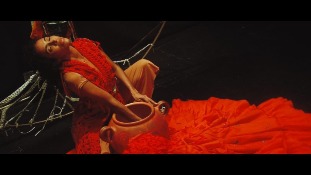 En esta propuesta interdisciplinar convergen el lenguaje plástico, el interpretativo, la palabra, el movimiento danzado, el performance. Las sonoridades fueron creadas a partir de la exploración de ritmos propios del Caribe colombiano y de aires andinos, los cuales refuerzan la atmósfera ritual y el universo onírico que propone la pieza.