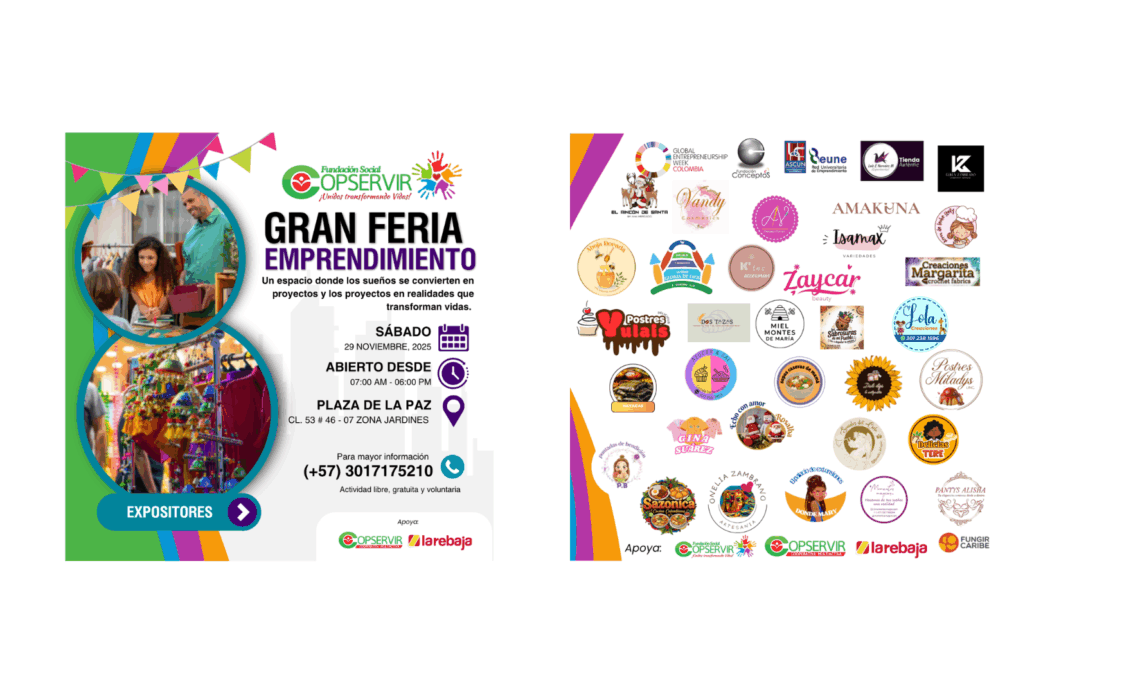 Desde la Fundación Social Copservir invitamos a toda la comunidad a disfrutar de nuestra Feria de Emprendimientos este sábado 29 de noviembre en la Plaza de la Paz. Un espacio para apoyar el talento local, impulsar sueños y compartir en familia. ¡Te esperamos! 3017175210 💚