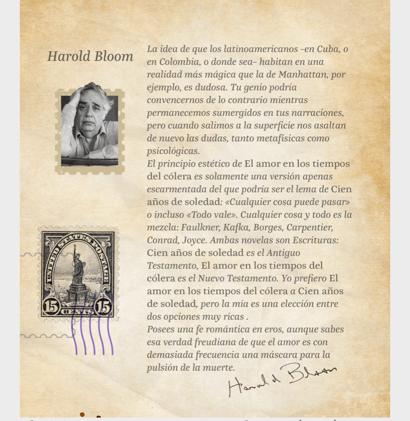 Las cartas que sí guardaron y recopilaron juntos fueron las que empezaron a llegar a su casa de Ciudad de México luego de la publicación de El amor en los tiempos del cólera. Sus remitentes eran parejas de ancianos que habían percibido en el drama de la novela una recreación poética de sus amores tardíos. “Usted contó la historia de mi vida”, le escribían. El libro que inspiraba a estos amantes es, en sí mismo, un homenaje a las vicisitudes del intercambio epistolar. Hay en él mensajes clandestinos, misivas exaltadas por la cursilería, folios repletos de pasión. Florentino Ariza, uno de los protagonistas, obtiene su primer trabajo en la Agencia Postal y copia mamotretos líricos a Fermina Daza, su Diosa Coronada. Cuando comienza a trabajar en la Compañía Fluvial del Caribe, ayuda a los enamorados analfabetos a escribir sus esquelas románticas “para descargar el corazón de tantas palabras de amor que se le quedaban sin usar en los informes de aduana”.