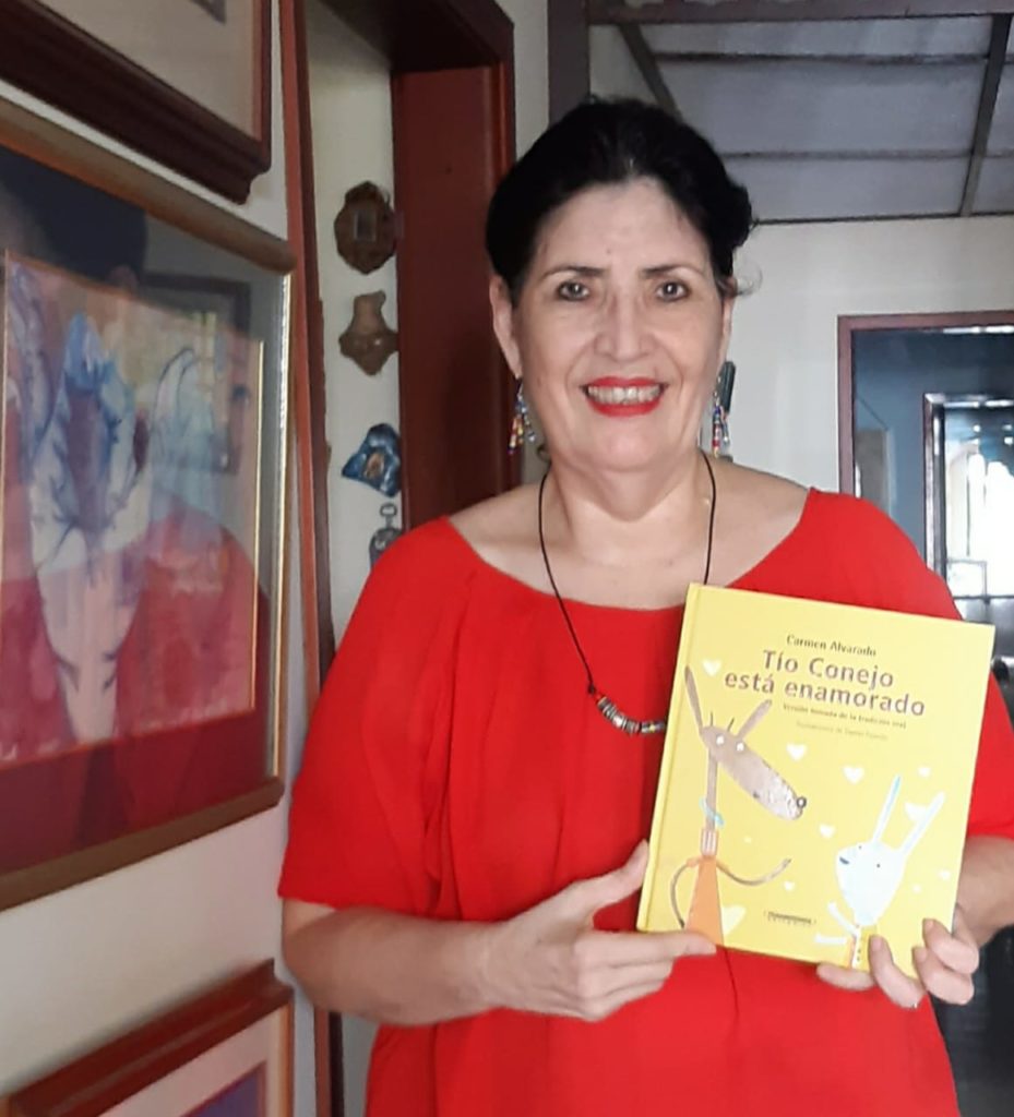 • Carmen Alvarado es una escritora barranquillera, que viene trabajando por la animación y promoción de la Lectura hace más de 30 años, inicialmente en el Centro Cultural de Comfamiliar Atlántico, su gran sueño cumplido. Allí lideró muchos programas para niños que tenían como eje central la Biblioteca Pública que ha sido un modelo no solo para la ciudad sino para la región y el país. Hasta hace cuatro años, Carmen tomó la decisión de escribir y compartir historias de la tradición oral traídas a la época y debidamente ilustrados. A la fecha con dos libros publicados: “Tío tigre y tres tristes conejos muertos” y “Tío conejo está enamorado” de Editorial Panamericana. Carmen se define como una enamorada de la tradición oral, «es el medio directo para llegar a la Literatura y en los más pequeños fortalecer su conciencia fonológica»