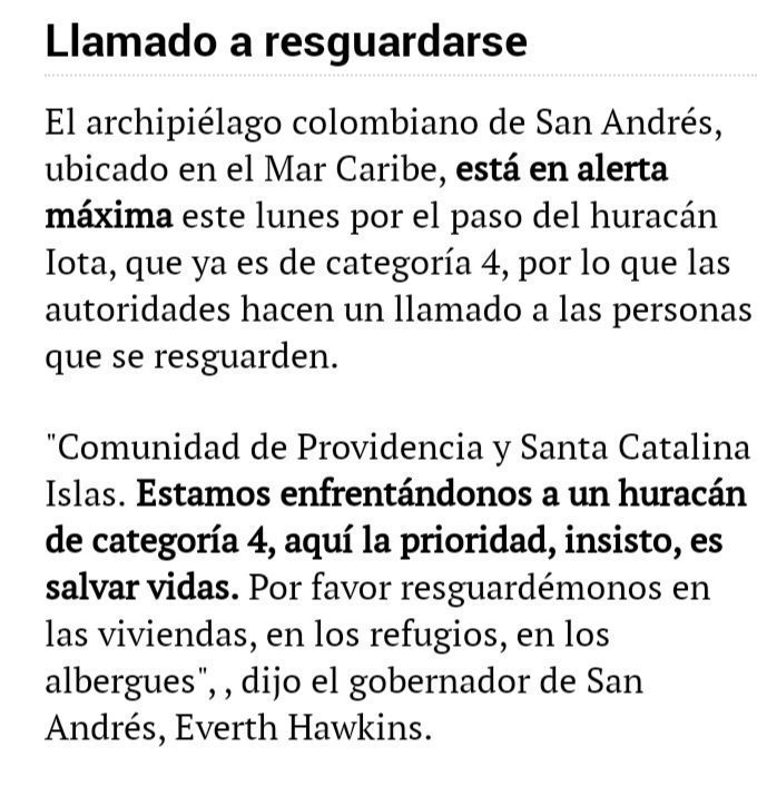 “Se advierte que IOTA continúe afectando las Islas Providencia, Santa Catalina e Isla Banco Quitasueño con vientos huracanados y una marejada ciclónica generada por este fenómeno de hasta 6 metros. Por su parte, las islas Serrana, Serranilla y Roncador, si bien se encuentran alejadas del ojo del huracán, están siendo afectadas fuertemente por las bandas del sistema”, precisó en una comunicación.