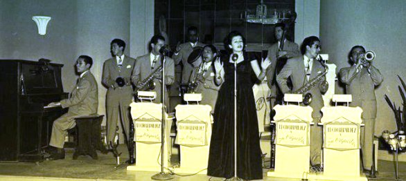 La famosa Orquesta de Lucho Bermúdez, consagrado músico nacido en el Carmen de Bolívar, durante una de sus actuaciones en el lujoso Hotel Nutibara de Medellín.[/caption]