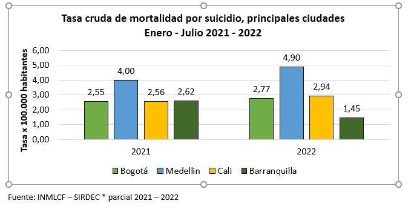 Por otro lado, de enero a julio del 2022, Barranquilla es la ciudad principal del país con menor tasa de mortalidad por suicidio.