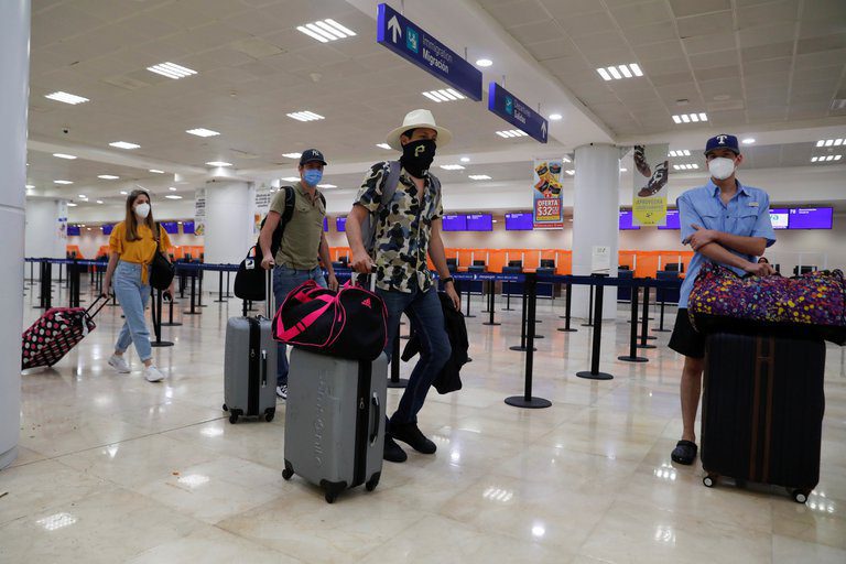 Turistas en el Aeropuerto Internacional de Cancún con máscaras faciales contra la Covid-19. Llegan dispuestos a disfrutar de las maravillosas playas y el radiante sol. (Reuters/ Henry Romero)