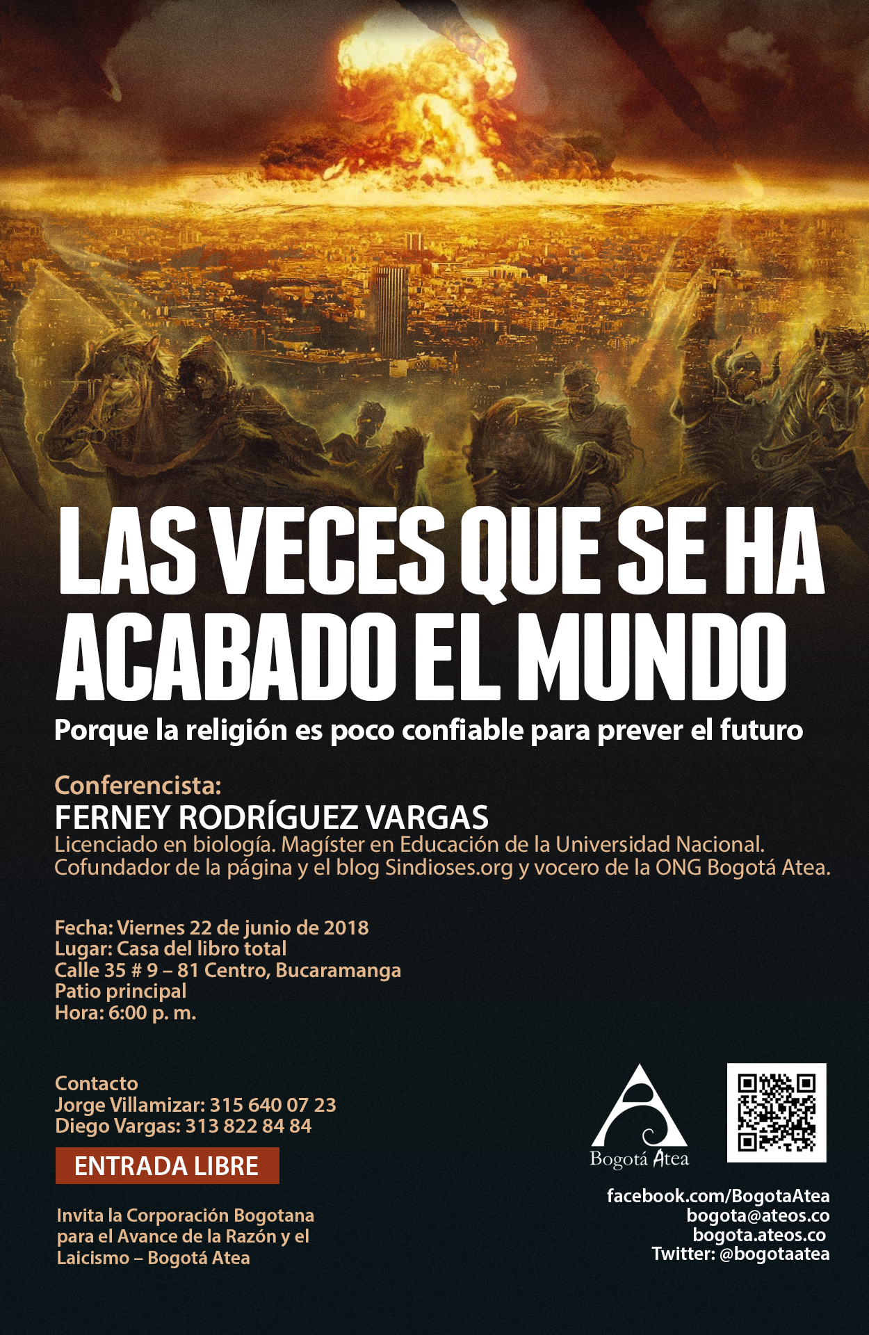 El 22 de junio del presente año, Ferney Rodríguez Vargas, vocero de la Corporación Bogotana para el Avance de la Razón y el Laicismo (Bogotá Atea) estará en Bucaramanga para dictar la conferencia “las veces que se ha acabado el mundo: porque la religión es poco confiable para prever el futuro”.