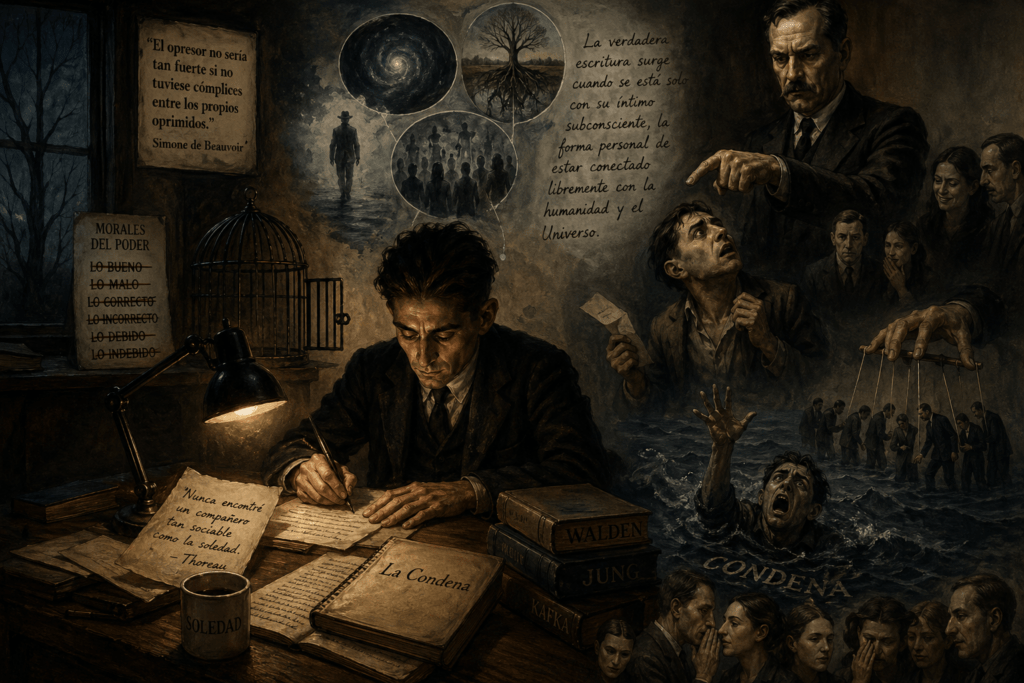 Dicen que Kafka, quien trabajaba en una compañía de seguros, amaba infinitamente su soledad. No soportaba su empleo tan burocrático, asfixiante y gris. En sus cartas y diarios describió que solo en la soledad de la madrugada, en ese silencio absoluto, lograba escribir con intensidad casi febril.