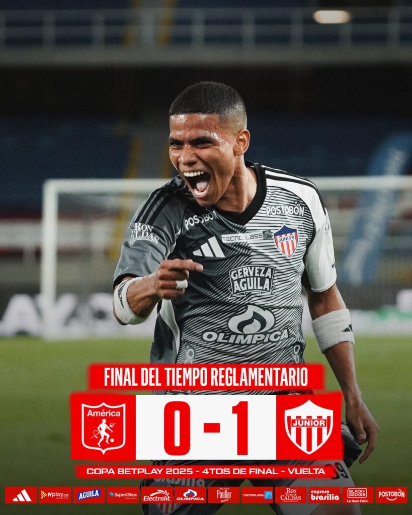 El fútbol de Junior sigue siendo más sombras que luces. A pesar de haber ganado en Cali 0-1 al América, el desempeño futbolístico del equipo no fue suficiente para buscar y anotar otro gol que lo clasificara directo a la semifinal de Copa Colombia. En el Pascual Guerrero, los rojiblancos titubearon mucho y no se les vio totalmente convencidos de salir vencedores, en el primer tiempo América estuvo a punto de irse arriba y ampliar la ventaja, sin embargo, Jefferson Martínez mantuvo al equipo vivo en la serie. Al minuto 38, tras una jugada de tiro de esquina, José Enamorado sacó un remate bien ubicado, marcando así el 0-1 que empataba el global 2-2 y llevaba la definición a los penales.
