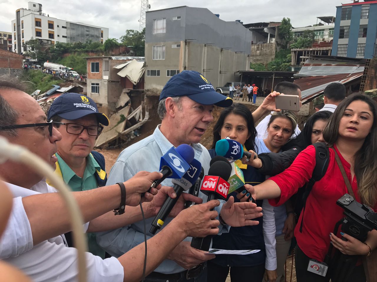 “Nuestros corazones y los de todos los colombianos están con las víctimas”, dijo a los periodistas el Jefe del Estado, quien desde la madrugada está al frente de la coordinación de los equipos de las entidades del Gobierno Nacional dispuestos para ofrecer asistencia inmediata a las víctimas de las avalanchas, e informó que se reportan 112 víctimas fatales. Reportó que en la noche del viernes llovió 130 milímetros cuando usualmente, en todo un mes, llueve 400 milímetros. ‘Es decir 30% de la lluvia de un mes se produjo anoche y eso provocó la creciente de tres ríos’, expresó.