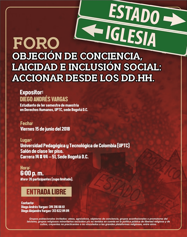 En este marco de acontecimientos desastrosos para la laicidad, el joven Diego Andrés Vargas, estudiante de maestría en Derechos Humanos de la Universidad Pedagógica y Tecnológica de Colombia, sede Bogotá, como parte de su trabajo académico hace extensiva la invitación al público afectado.