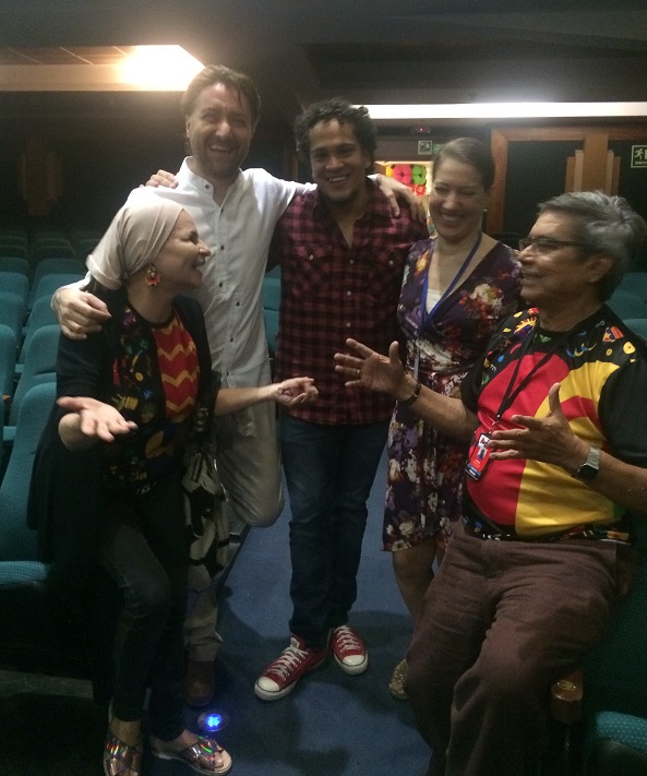 Nira Figueroa, Pala, Roberto Camargo, Piedad Monsalve y Rafael Sarmiento Coley celebran la magnífica presentación del cantautor paisa y su panelista.