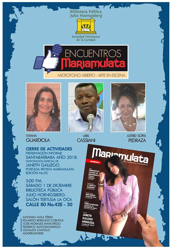 Este sábado 1 de diciembre a las 5:00pm se realizará la presentación de la Edición # 20 de la Revista Cultural MariaMulata dirigida por el escritor Federico Santodomingo, en el marco de un recital poético integrado por los poetas: Uriel Cassiani de Palenque, Tatiana Guardiola Sarmiento y Astrid Sofía Pedraza. Con ello se da clausura a la Agenda Cultural 2018 de los Encuentros MariaMulata – Micrófono Abierto, un proyecto liderado por SantaBarbara Editores, Entrada Libre.