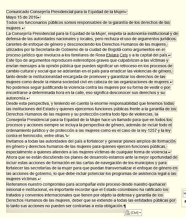 El 24 de mayo del 2012 los colombianos nos despertamos con una noticia horrible, estremecedora y que engrosaba las estadísticas de violencia contra la mujer. Así relataba en ese entonces la revista Semana el suceso: «Escalofriante. Así fue el crimen de Rosa Elvira Cely, una mujer de 35 años cuya escena de agonía parece extraída de un episodio del Medioevo. Pero todo ocurrió en el Parque Nacional, en pleno corazón de Bogotá y el perpetrador es un amigo del colegio de la víctima. Los bomberos y la Policía encontraron allí a Cely, malherida, luego de que ella misma hizo angustiosas llamadas de auxilio desde su celular. Fue el pasado jueves 24 de mayo. Según explicó William Cardona, coordinador de la Línea de Emergencias 123, la primera llamada se registró a las 4:47 de la mañana y en ella se escuchó la voz angustiada de una mujer que decía haber sido violada en el Parque Nacional y pedía socorro.
