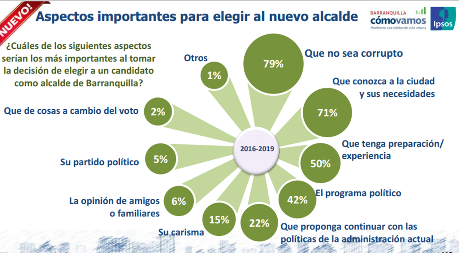Frente a los indicadores de evaluación de la Alcaldesa Elsa Noguera, éstos obtienen un repunte en 2014 que se mantiene en 2015. Lo mismo sucedió con los indicadores de conocimiento, favorabilidad y gestión del Concejo de la ciudad; así como las JAL. Se presentan oportunidades de mejora en la percepción de transparencia, confianza en los procesos de contratación, satisfacción con la información entregada a los ciudadanos y lucha contra la corrupción. El empleo, la seguridad, la educación, la salud y la vivienda son los temas que debe tener como prioridad el próximo gobierno. Los aspectos más importantes para los barranquilleros a la hora de elegir un nuevo alcalde son que no sea corrupto y que conozca a la ciudad y sus necesidades.