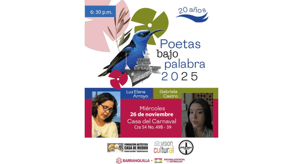 Poetas bajo palabra es una propuesta de la Fundación Casa de Hierro y se ha configurado como el espacio de poesía permanente de Barranquilla, que ya lleva 20 años de trabajo continuo. Cuenta con el apoyo de la Fundación Visión Cultural, y este año hace parte de los proyectos ganadores de la Convocatoria de Apoyos Concertados del Distrito de Barranquilla 2025: invitación a proyectos significativos, por parte de la Secretaría de Cultura y Patrimonio de la ciudad.