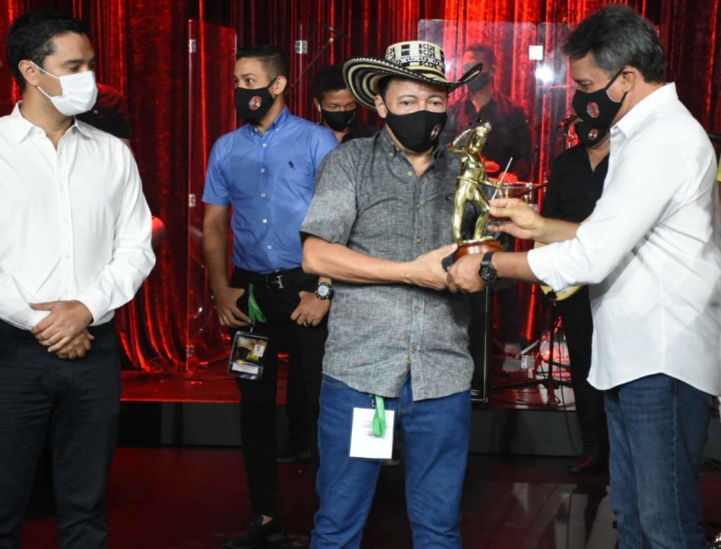 El nuevo Rey Vallenato, en la categoría profesional, Manuel Vega, recibe el trofeo de manos del presidente del Festival, Rodolfo Molina Araujo, en presencia del alcalde de Valledupar, ‘Mello’ Castro.