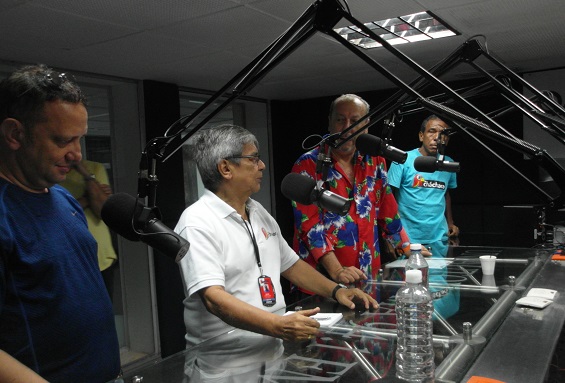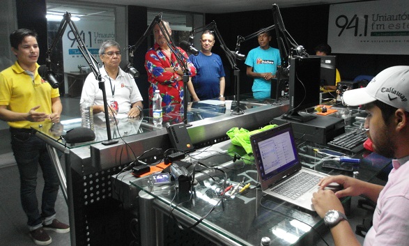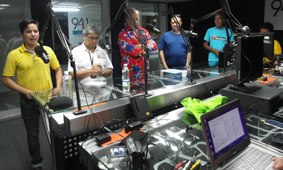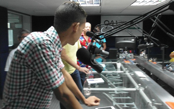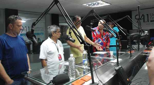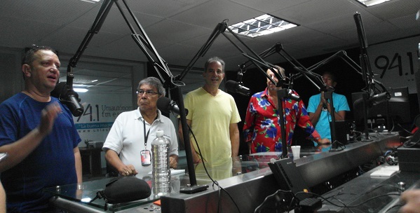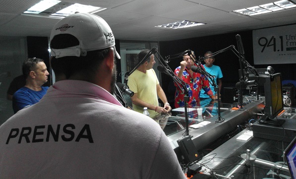Ya llegó Chelito y espera su turno al micrófono, mientras Jorge Mario hace la presentación, Rafael Sarmiento verifica la hora, y Adlai, Héctor Cabarcas y Estela Monterrosa están atentos.