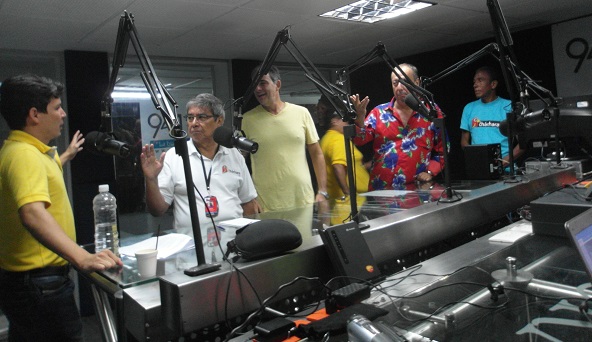 Ya llegó Chelito y espera su turno al micrófono, mientras Jorge Mario hace la presentación, Rafael Sarmiento verifica la hora, y Adlai, Héctor Cabarcas y Estela Monterrosa están atentos.